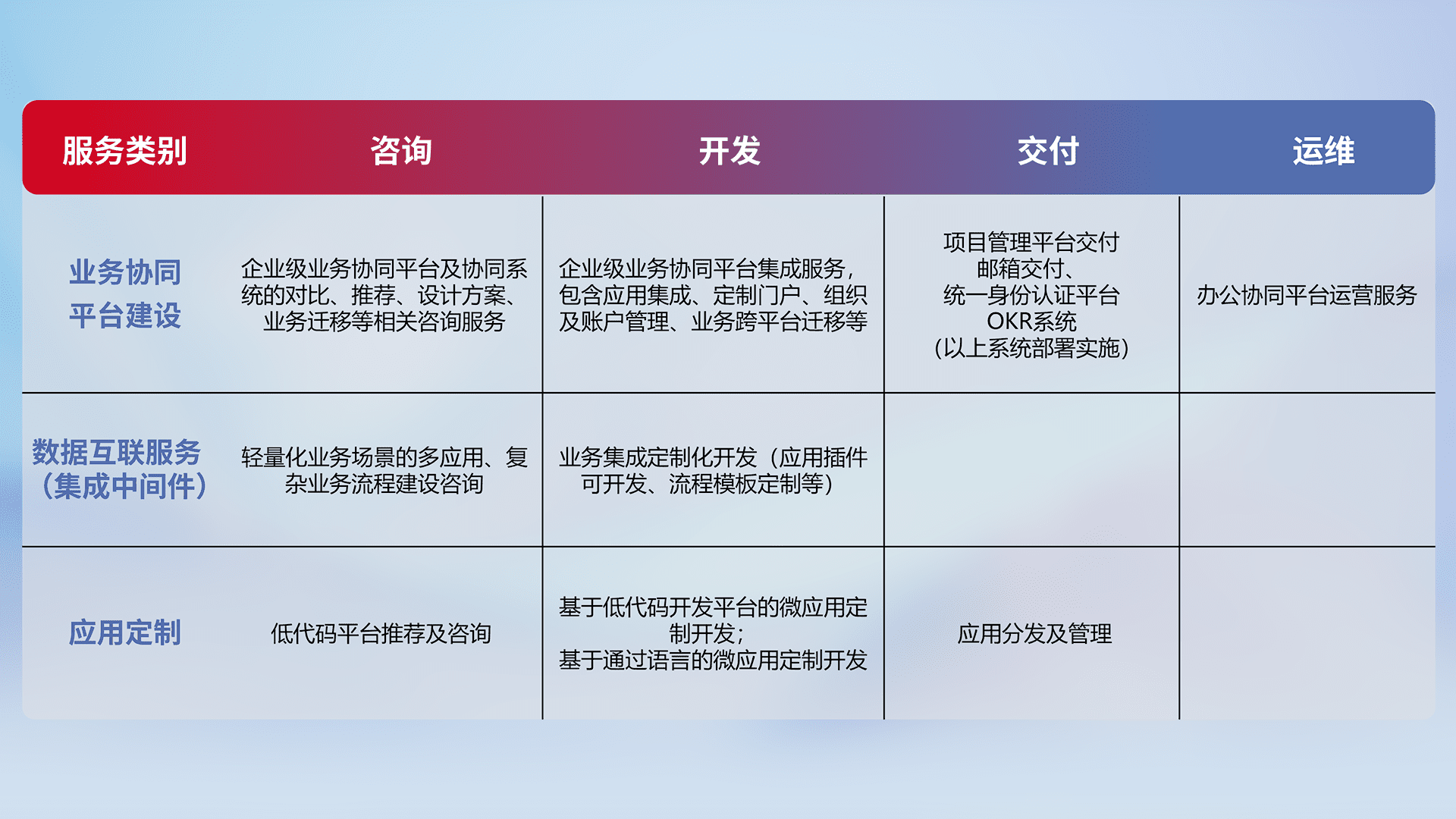 针对钉钉、、企微、、、IDaas等平台级产品提供产品的规划、、、、方案、、交付、、定制化开发等服务,,实现如统一协同办公、、智能客户服务、、、混合会议管理、、、、智能数据查询、、、等业务场景,,实现数字化转型。。
