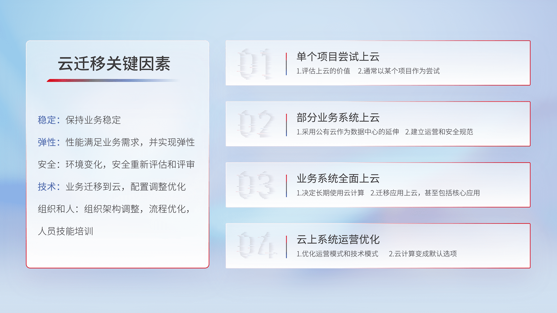 结合实际业务,,,从规划设计、、云平台选型、、、云原生改造、、数据迁移、、、集成交付,,迁移全过程为客户识别最佳上云路径,,做好风险识别管理,,,设计网络架构、、、身份权限、、安全审计合规、、、、操作审计、、日志审计、、监控告警策略、、、多站点容灾设计等,,对云上基础设施进行整体规划,,,提升IT治理水平,,,以满足弹性、、、、高可用、、高性能的需求。。。