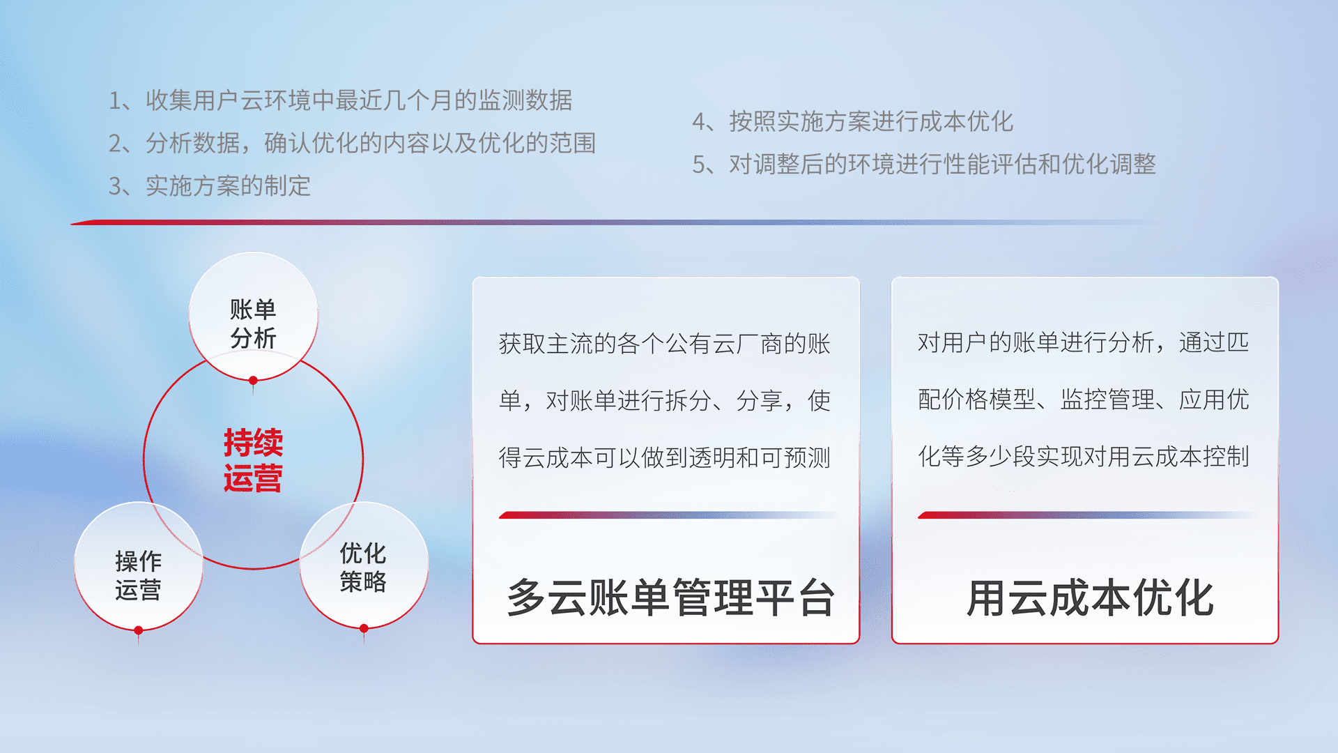 通过多云纳管,,,以统一的资源数据模型把客户的云资源进行抽象和封装,,,,进而实现对多云资源的统一操作,,,,保障云资源管理的可靠性、、稳定性与可用性。。量身定制化运维内容,,,,配置、、、开发运维、、补丁管理、、、备份、、、、监控、、认证和访问管理、、、审计和日常巡检等,,,,保障在用云过程中的可靠度,,,,稳定度以及高可用率。。。