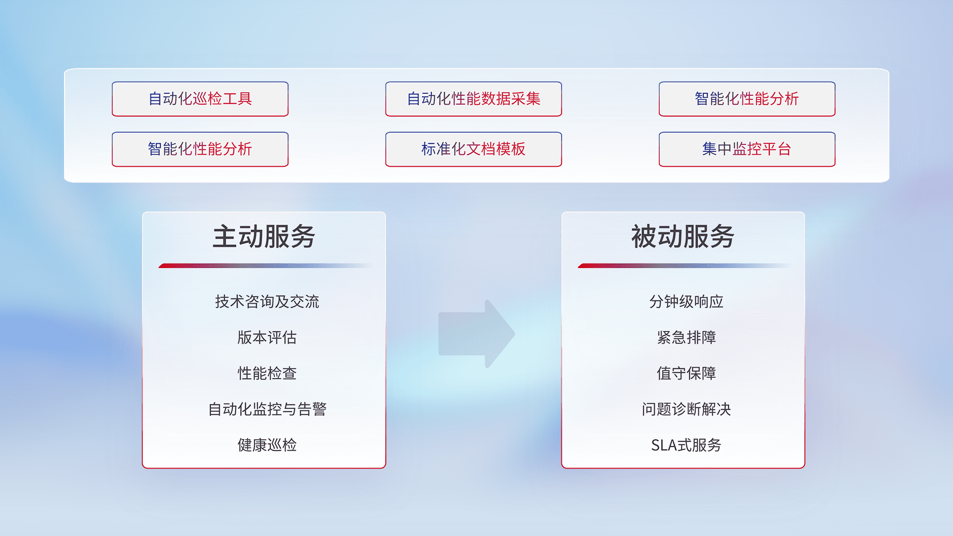 智能化工具和标准化文档,,保障服务质量,,,提供主动服务(包含技术咨询、、、、版本评估、、、、性能检查、、、自动化监控与告警、、、健康巡检)和被动服务包含(分钟级响应、、紧急排障、、、、值守保障、、、问题诊断解决、、、、SLA服务)。。